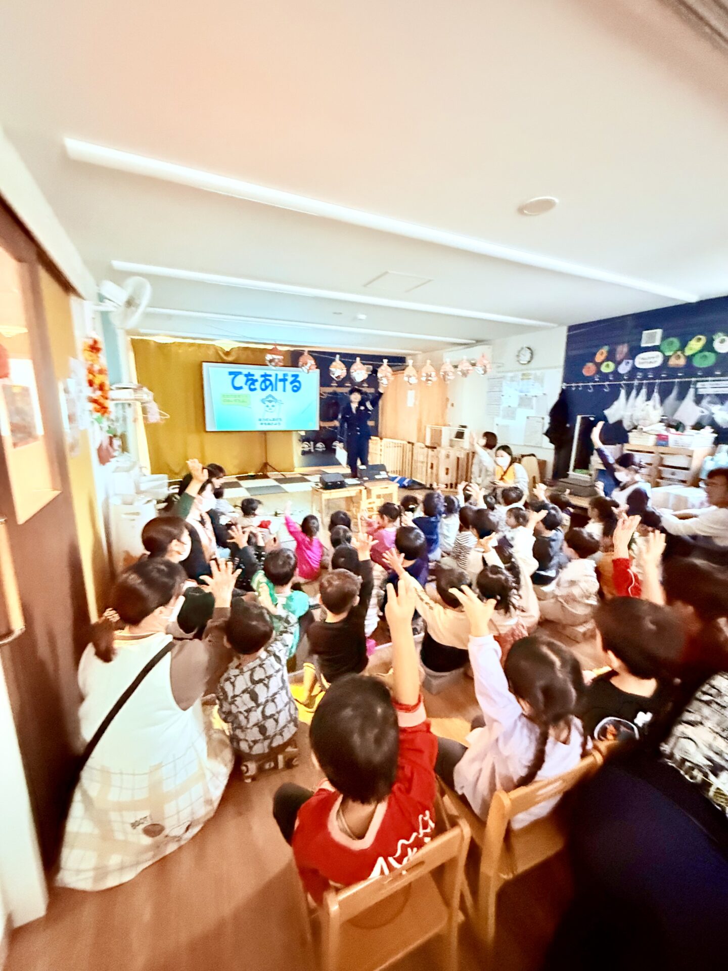 警察官の方のお話が始まると、子どもたちはいつも以上にピンと背すじを伸ばし、真剣な表情で耳を傾けていました。「道路ではどう歩くの?」「車が来たらどうする?」といった大切なお話に、子どもたちも自然と気持ちが引き締まっている様子でした。