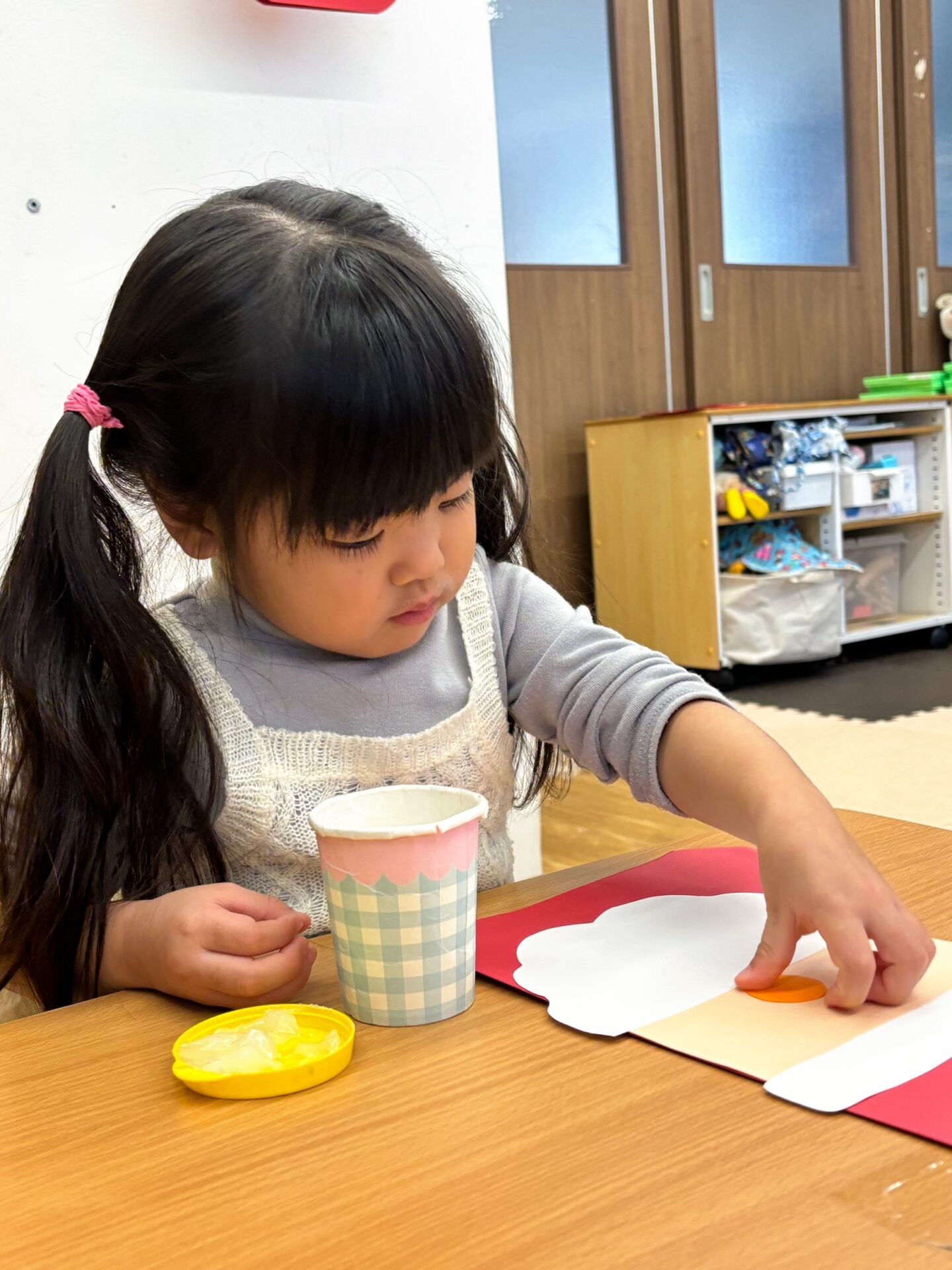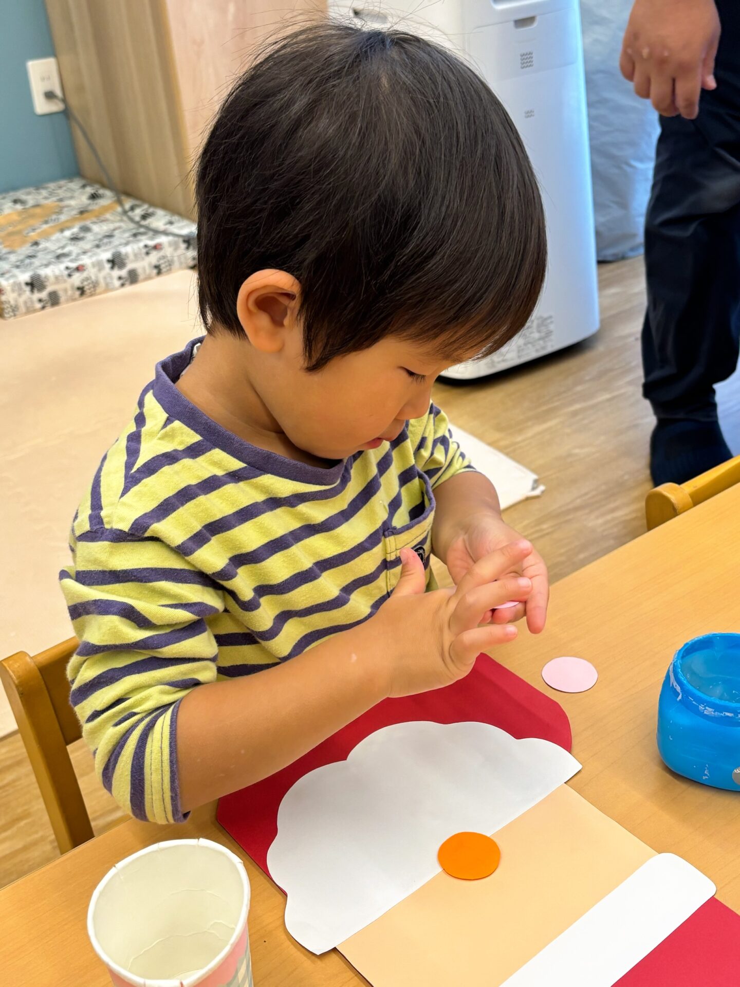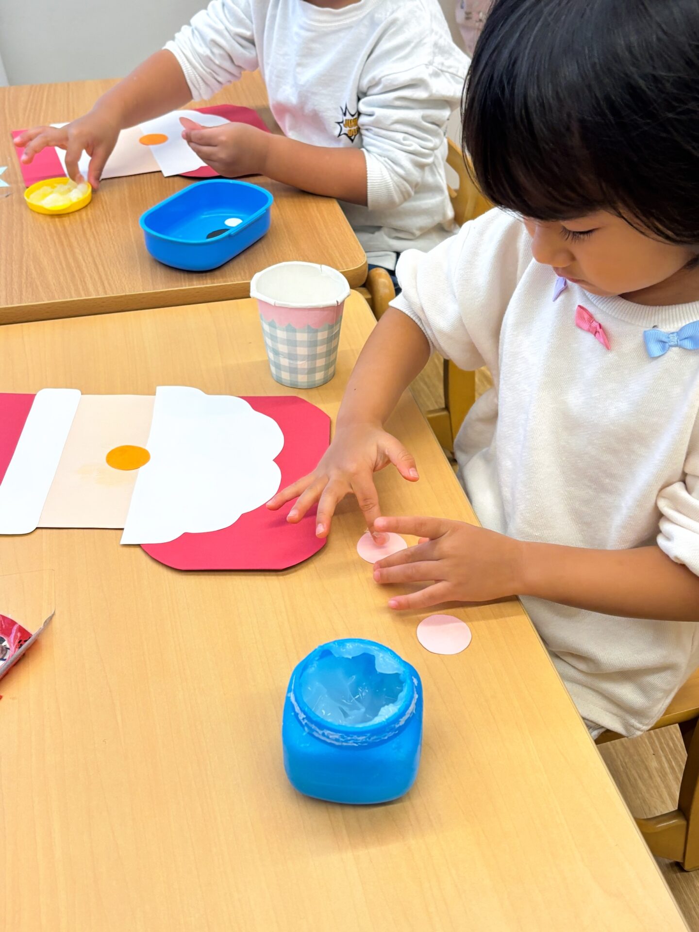 「ここかな?」「もうちょっと上かな?」と、友だちや先生と相談しながら貼る姿に、どれみ組さんらしい可愛らしい集中タイムが流れていました。