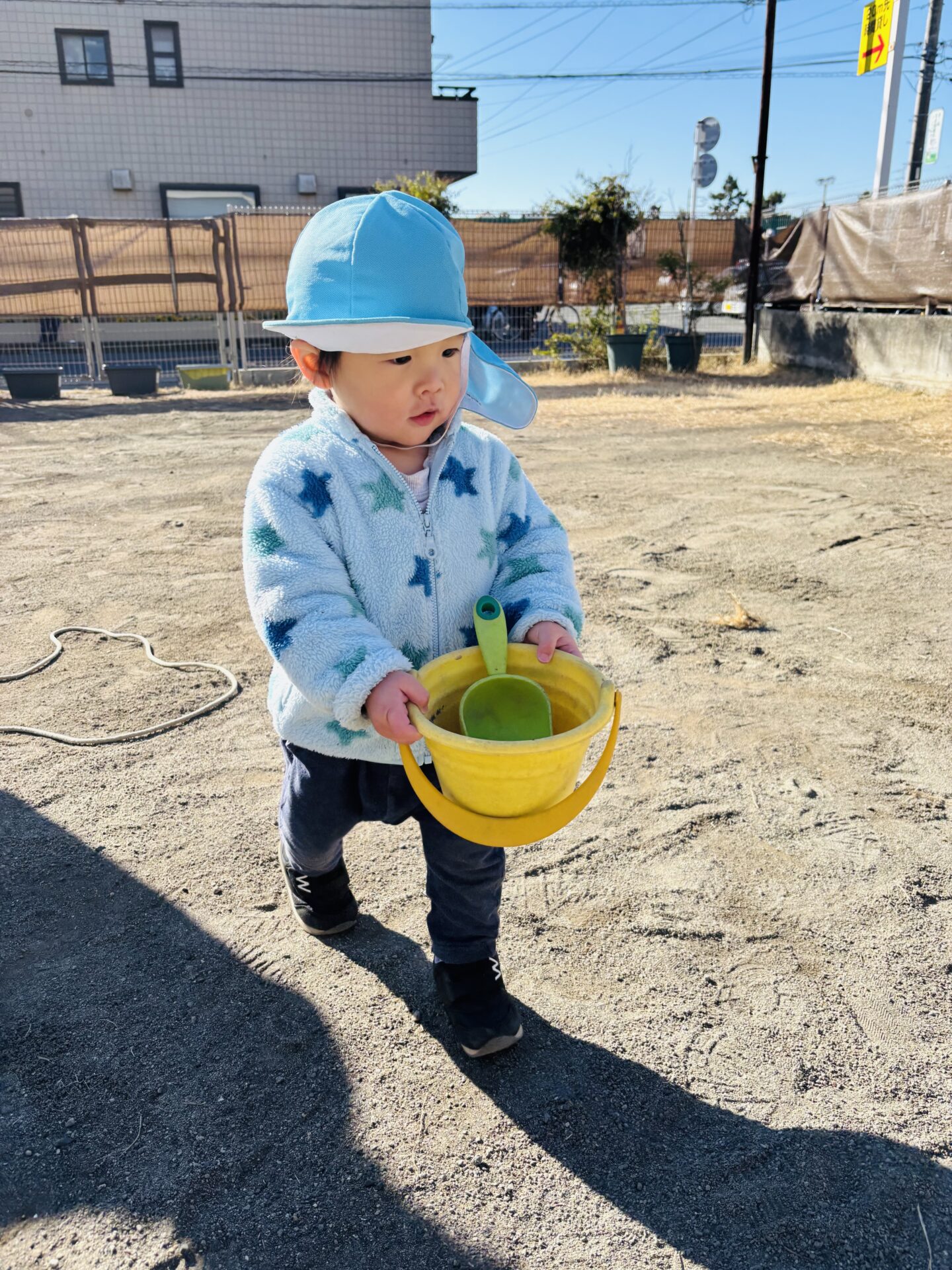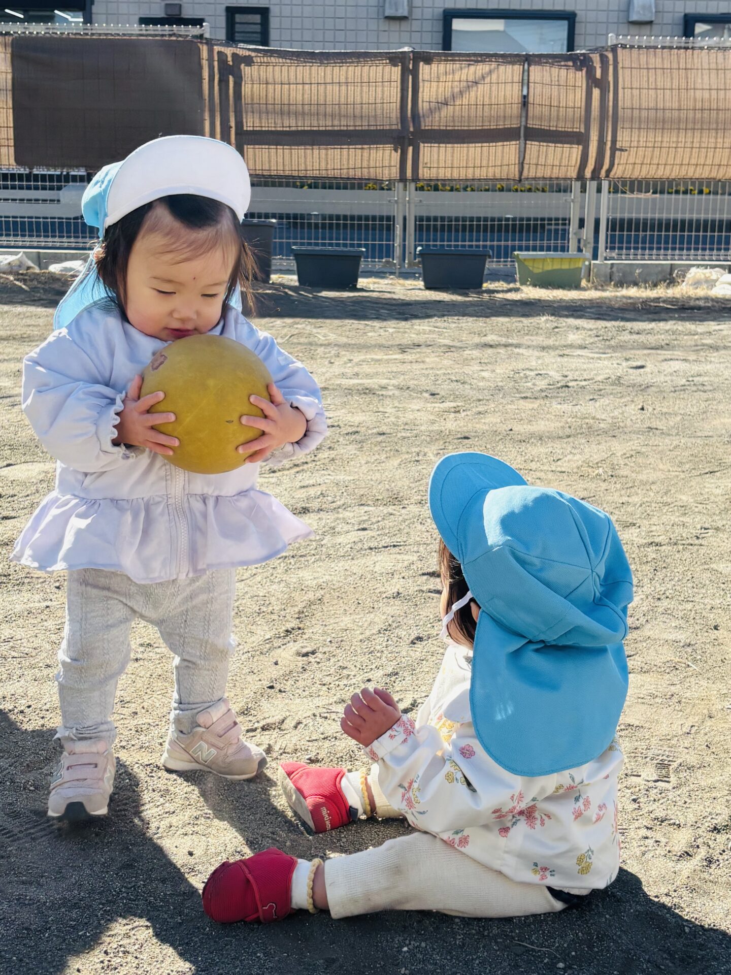 暖かい日差しの中、0歳児クラスのお友達が園庭で元気いっぱい遊びました。