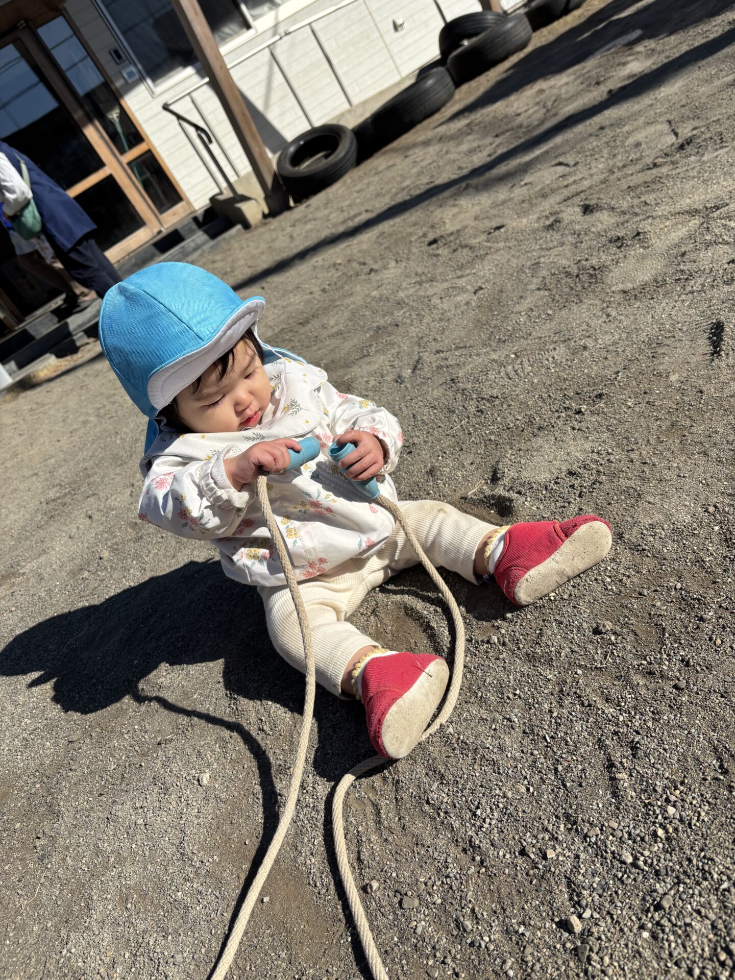 お友達と一緒に縄跳びをつなげて、電車ごっこを楽しむ姿も見られ、「しゅっぱつしんこう!」と保育者の声掛けに合わせて、にこにこ笑顔で動く様子がとても可愛らしかったです。