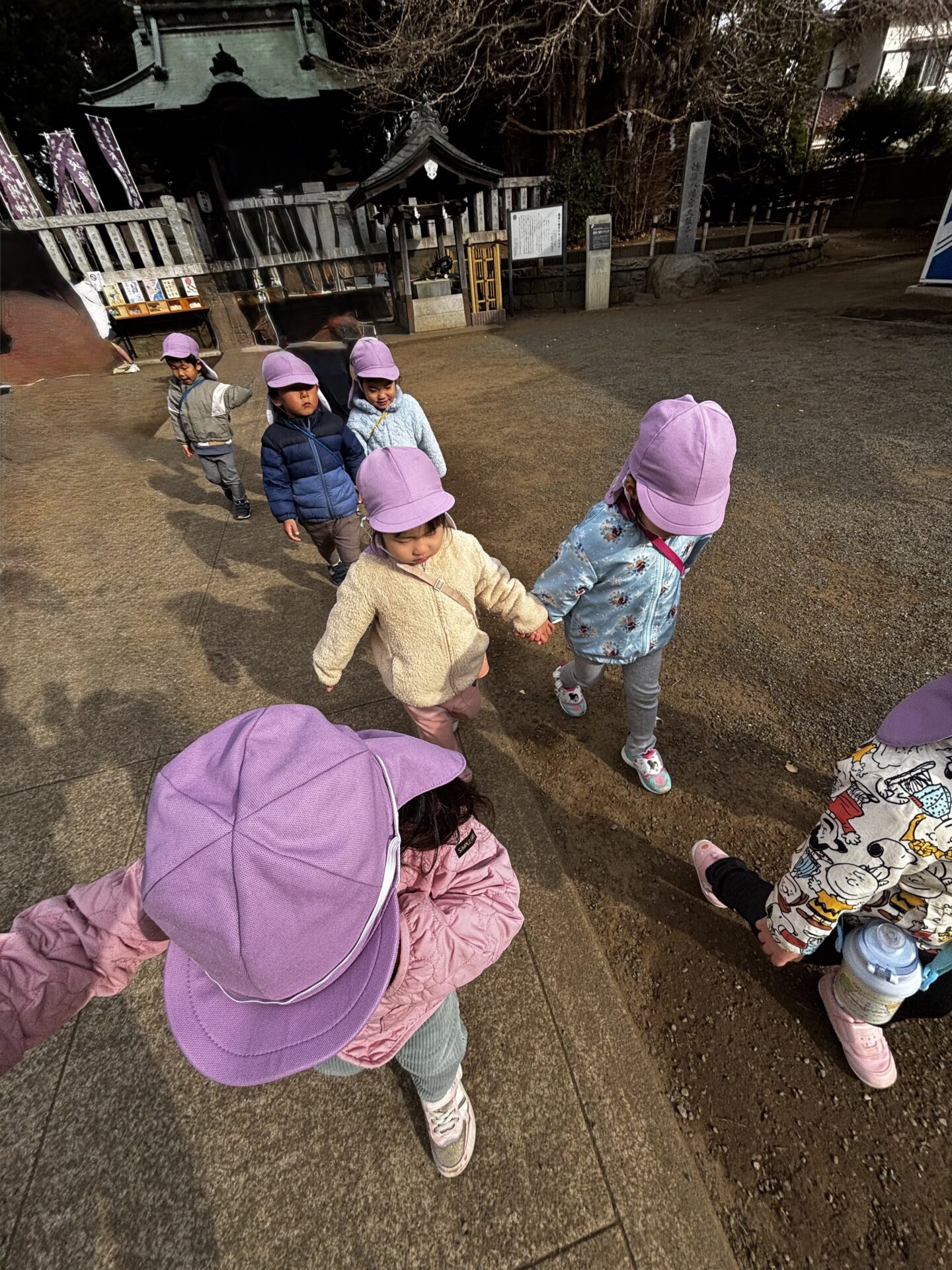 2歳児クラスのお友達みんなで、近くの神社へ初もうでに出かけました。