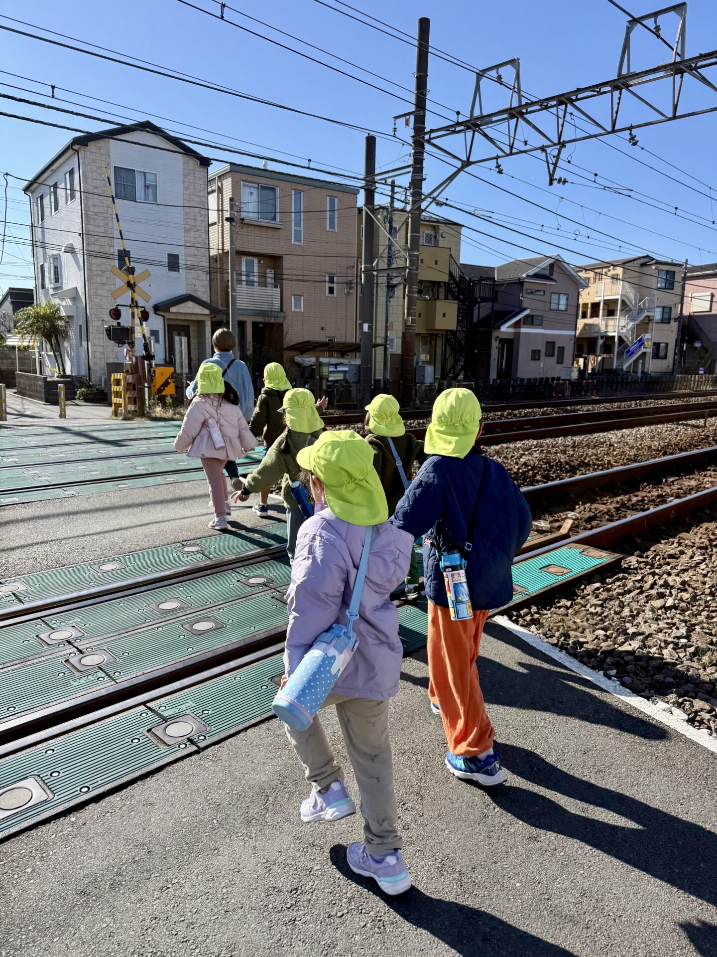 魚屋さんまでは少し距離があり、途中では珍しく踏切を渡って向かいました。電車が通る様子や、カンカンと鳴る音に子どもたちは興味津々。「電車くるかな?」「はやいね!」と、目を輝かせながら歩く姿が印象的でした。