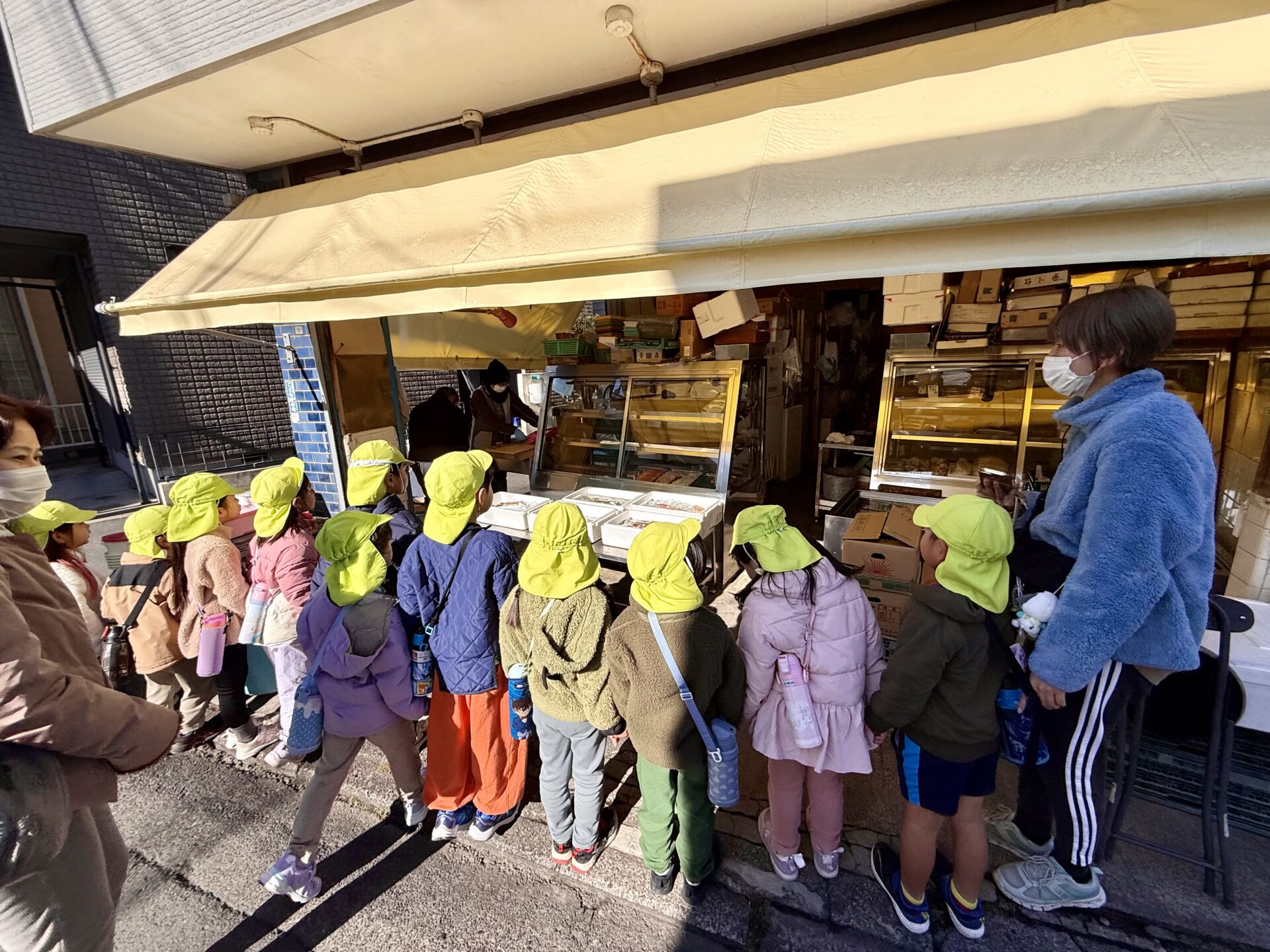 年長クラスでは、食育活動の一環として、いつも給食でお世話になっている魚屋さんへ見学に行ってきました。